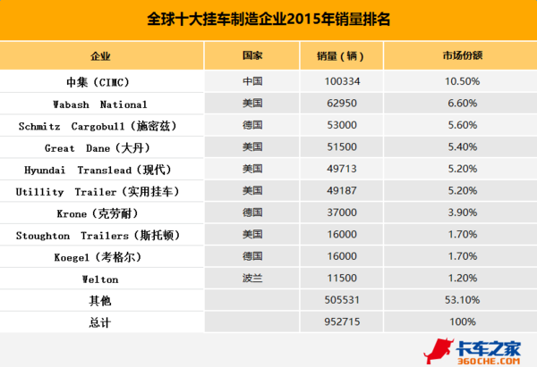 目前中集的掛車業(yè)務(wù),在全球擁有25家工廠,13000名員工(中國(guó)10000人,海外3000人)。2015年中集掛車業(yè)務(wù)的總收入為21.3億美元(中國(guó)銷售額9.7億美元,北美銷售額7.36億美元),凈利潤(rùn)1.01億美元,銷售掛車100334輛,以10.5%的份額名列全球掛車第一,包括在中國(guó)市場(chǎng)和美國(guó)市場(chǎng)的市占率位居第一。